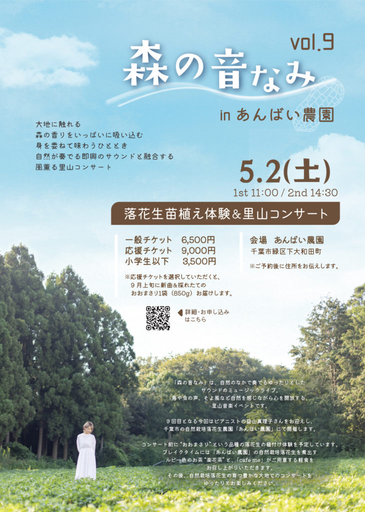5/2(土) シンガーソングライター ゆうなみさんの コンサート開催のお知らせ 投稿日 2026年3月29日 著者 san カテゴリー お知らせ 千葉出身のシンガーソングライター ゆうなみさんのコンサートを、畑で開催できることが決まりました!「森の音なみ」は、自然のなかで奏でるゆったりとしたサウンドのミュージックライブ。鳥や虫の声、そよ風など自然を感じながら心を開放する、里山音楽イベントです。9回目となる今回はピアニストの益山真理子さんをお迎えし、自然栽培落花生農園「あんばい農園」にて開催します。 詳細・お申し込みは、イベント特設ページへ